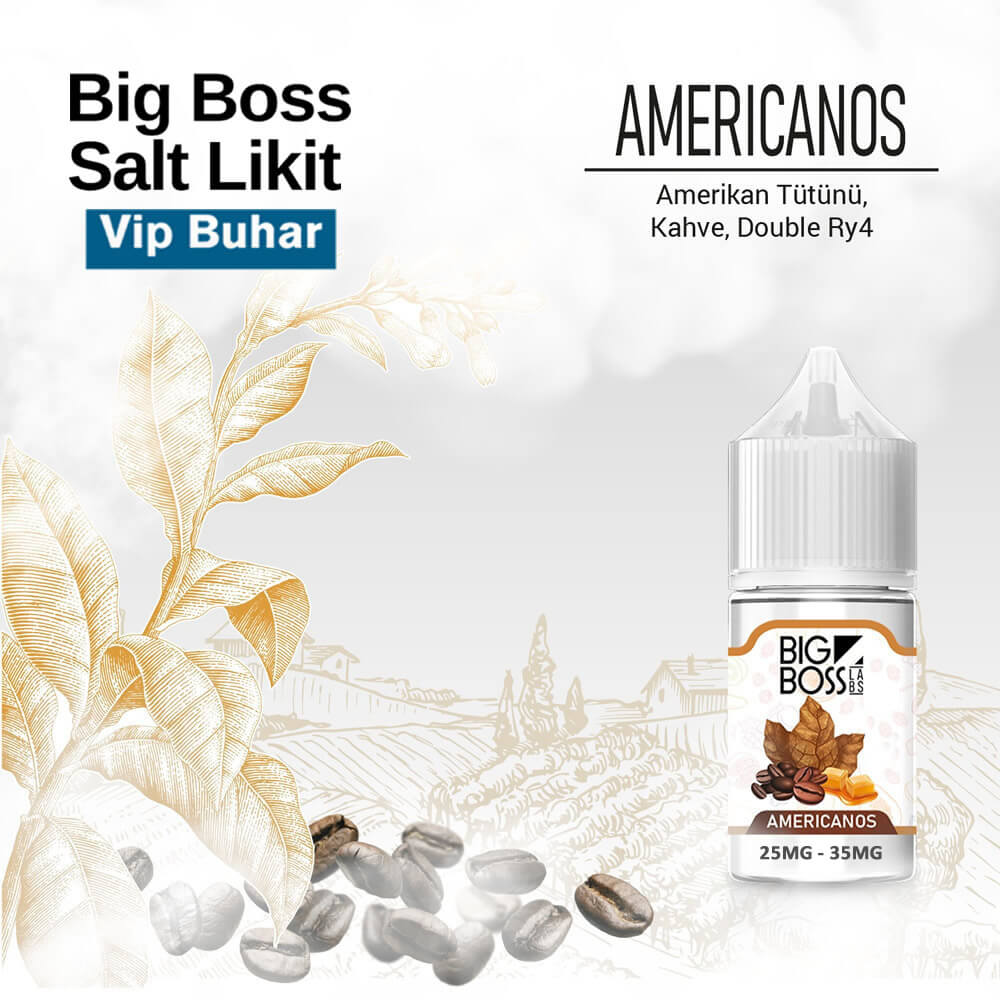 Big Boss Americanos Salt Likit Big Boss’un tütün aromalı bir likitidir. Tütün aromalı likit sevenlerin tercih edeceği bu likitte tütün ve kahve aromaları mevcuttur.